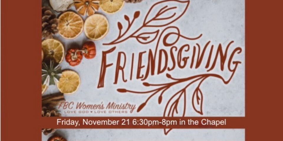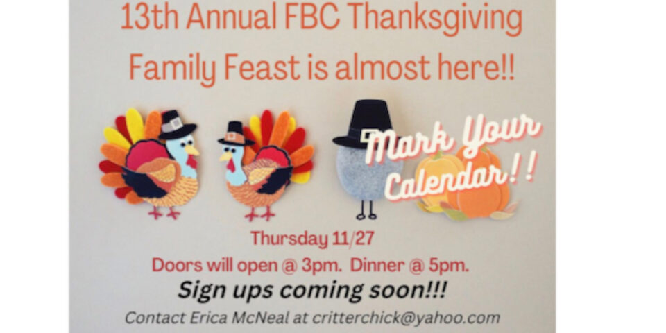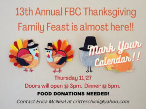 Join us for Thanksgiving at FBC! Thursday, NOv. 27. Sign up at the link below. We are in need of Food Donations. Click on the link below to volunteer to bring food or drop off food if you cannot attend.