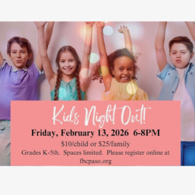 Parents, want to join us for our FBC Marriage Connection?…could you use a Valentine’s date night?…a couple hours with friends?…or even just some time to go grocery shopping without the kids??? Bring your kids to FBC’s Kids Night Out! They’ll have a blast doing arts and crafts, and playing games with our awesome team of volunteers,…